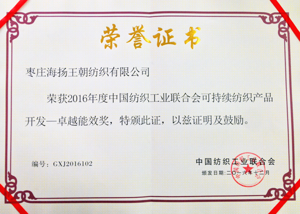 2016年12月12日中國紡織工業聯合會在北京召開了2016中國紡織創新年會,公司總經理孫勇受邀參會。在此次大會,我公司被授予“2016年度中國紡織工業聯合會可持續紡織產品開發-卓越能效獎”榮譽證書,充分肯定了我公司多年來在能源利用和節能方面取得的成績,這也堅定了公司走科技含量高、經濟效益好、資源消耗低、環境污染少的新型工業化道路的決心,努力將海揚王朝打造成國際知名的現代化紡織企業!